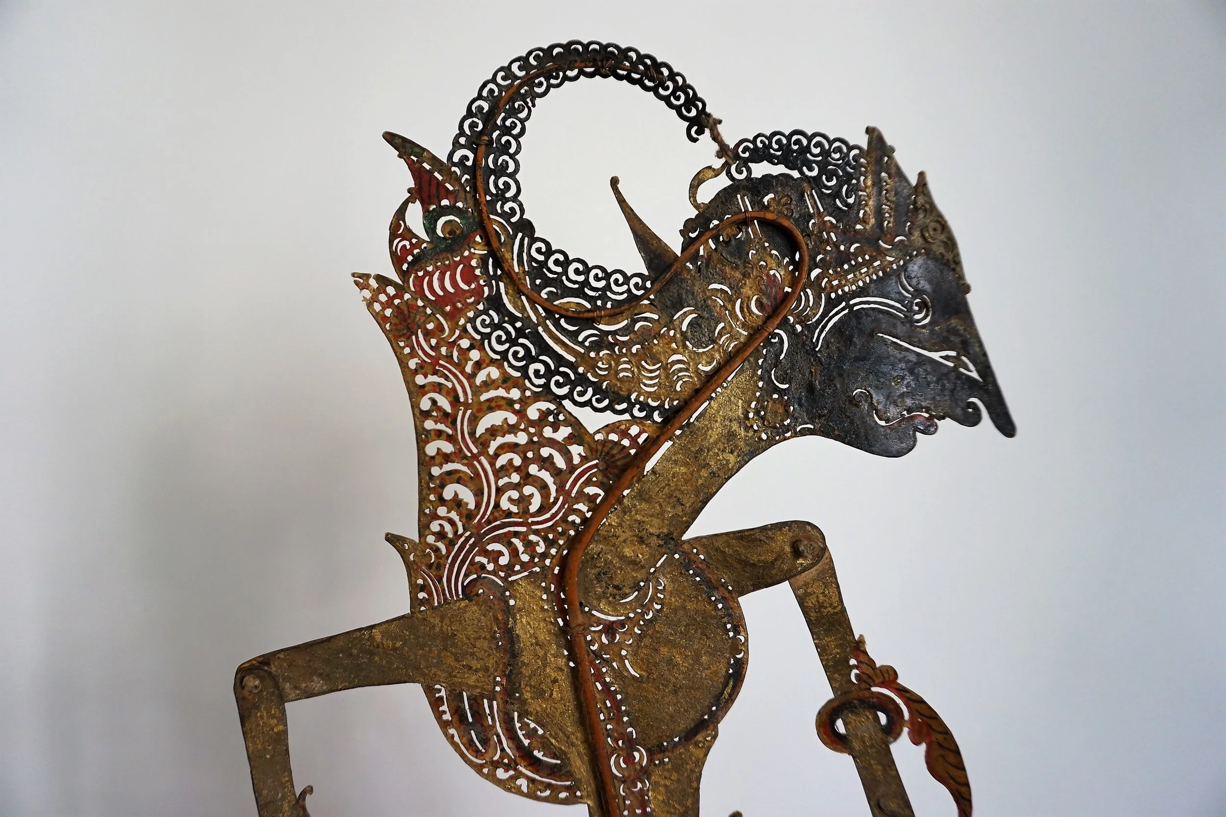 Marioneta Wayang Kulit o marioneta tradicional de sombras utilizada en el teatro de sombras en Indonesia.
